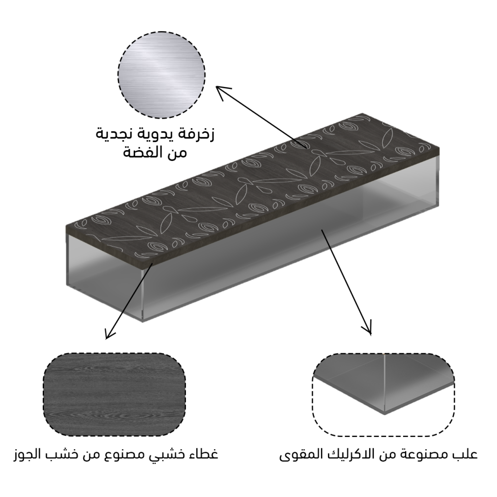 • صندوق بغطاء خشبي فاخر مناسب للضيافة والتخزين. • زخارف من الفن النجدي مرسومة يدوياً. • مرسوم بخيوط الفضة . • منتجات و تصاميم حصرية و خيار مثالي لإهد...