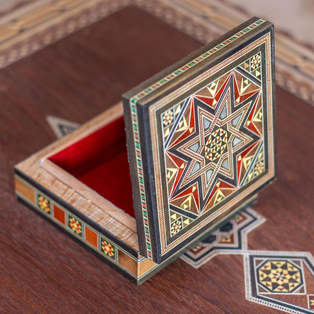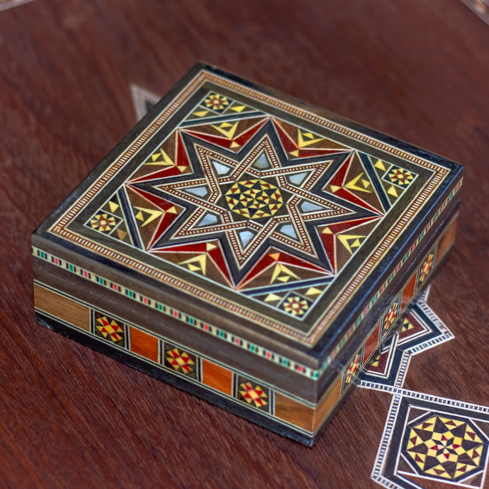 • تصميم يدوي فريد تم تجميع قطع الخشب الصغيرة بعناية مع تطعيمها بالعاج والصدف لتشكيل أنماط تراثية دمشقية. • تراث عريق يجسد التراث الدمشقي الذي يعكس أصا...